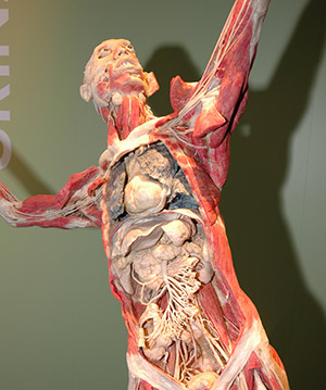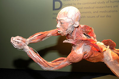 Экспонаты его выставок, кочующие по всему миру, вызывают шок. Шахматист со вскрытым черепом, склонившийся над доской. Частично разделанный баскетболист. Человек, перекинувший через плечо собственную кожу. Беременная женщина с младенцем в животе, ребенок на лошади-качалке. Пластинаты сохраняют подвижность, им можно придать любую форму.